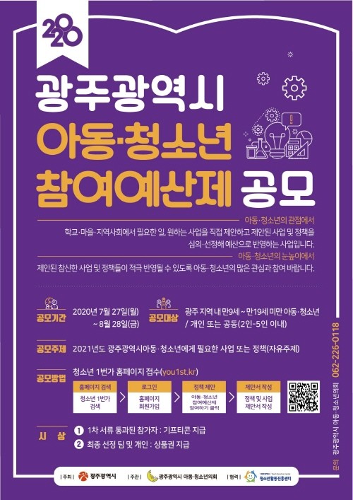 공모주제는 2021년도 광주광역시 아동·청소년에게 필요한 사업 또는 정책으로 자유 주제이며, 참여 방식은 ‘청소년 1번가’ 홈페이지 청소년참여예산제 참여하기를 통해 온라인으로 제안할 수 있다. 공모기간은 2020년 7월 27일(월) ~ 8월 28일(금)까지이다.