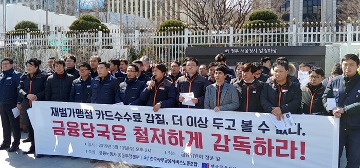 전국사무금융서비스노동조합(이하 노조)은 13일 금융위원회 앞에서 기자회견을 갖고 "법적인 제도가 뒷받침되지 않는 한 카드사에 대해 우월적 지위를 가진 초대형 재벌 대기업에 대한 수수료 인상은 불가하다"며 "재벌 대기업이 수수료 인상을 거부할 시 처벌을 강화하는 실질적이고 실효성 있는 양벌규정이 필요하다"고 주장했다.