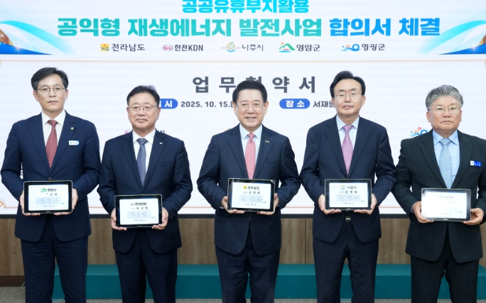 전라남도는 15일 새정부의 재생에너지 대전환 기조와 재생에너지 보급 확대 정책에 따라 나주시, 영광군, 영암군, 한전KDN과 탄소중립 실현·에너지 기본소득 실현을 위한 ‘공익형 재생에너지 발전사업’ 업무협약을 했다고 밝혔다.