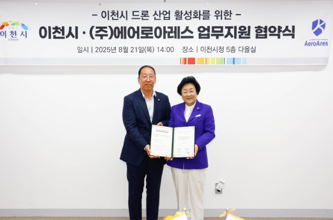 이천시는 8월 21일, 무인항공기(UAV) 및 안티드론 전문기업인 ㈜에어로아레스와 드론 산업 육성을 위한 업무지원 협약(MOU)을 체결했다.
