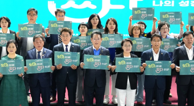 | ▲ 김영록 전라남도지사가 21일 순천 팔마실내체육관에서 열린 ‘2025년 전남 여성 일자리 박람회’에서 참석자들과 퍼포먼스를 하고 있다. |