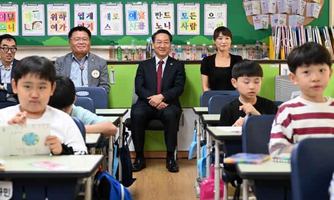 ▲ 유정복 인천광역시장이 25일 남동구 상아초등학교에서 늘봄프로그램 '지구를 지키는 초록이' 수업을 참관하고 있다. |