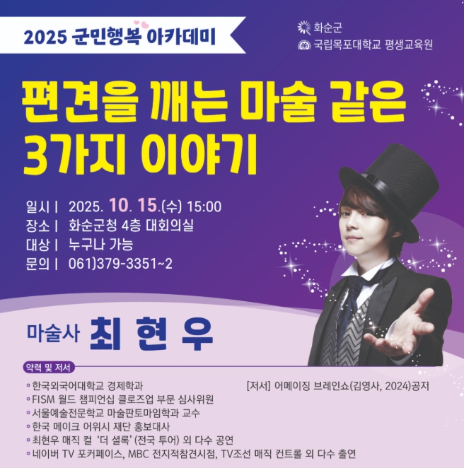 화순군은 오는 10월 15일 수요일 오후 3시, 화순군청 4층 대회의실에서 '2025 군민행복 아카데미 8회차 강연을 개최한다고 밝혔다.