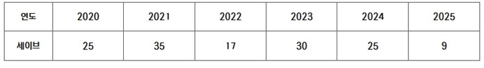 | ▲ 롯데 김원중 연도별 세이브 (2025. 4. 30 기준) |