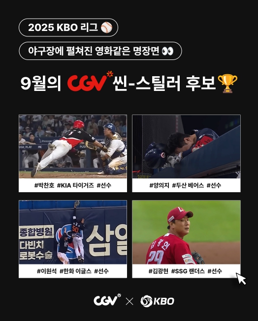 KBO와 CGV가 공동 제정한 ‘월간 CGV 씬-스틸러상’의 9월 수상자 후보로 KIA 박찬호, 두산 양의지, 한화 이원석, SSG 김광현 등 총 4명의 선수가 선정됐다.