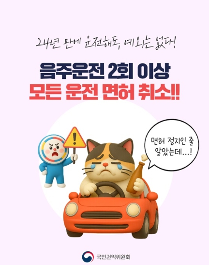 음주운전 2회 이상 모든 운전 면허 취소!!