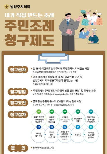 남양주시의회는 주민이 직접 조례의 제정, 개정, 폐지를 청구할 수 있는 주민조례청구 제도의 활성화를 위해 대시민 홍보를 강화할 계획이라고 밝혔다.