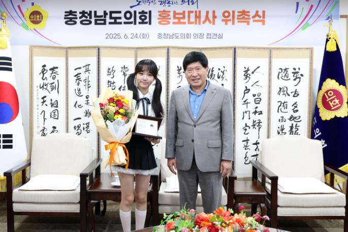 도의회는 24일 의회 접견실에서 홍성현 의장(천안1‧국민의힘)과 교육위원회 이상근 위원장(홍성1‧국민의힘), 지민규 의원(아산6·무소속), 의회사무처 간부 공무원 등이 참석한 가운데 홍보대사 위촉식을 개최했다.