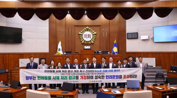 나주시의회는 15일 제273회 임시회 제1차 본회의를 열고 ‘반려동물 사체 처리 법규 개정 촉구 건의안’을 채택했다.