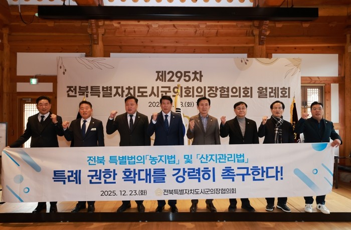 지난 23일 무주 태권도원에서 열린 전북특별자치도 시군의회의장협의회(회장 남관우 전주시의회 의장) 월례회에서 손종석 순창군의회 의장이 건의한 전북특별법 핵심 특례인 '농지법'과 '산지관리법'의 실효성 확보를 위한 권한 확대를 촉구하는 건의안이 채택됐다.
