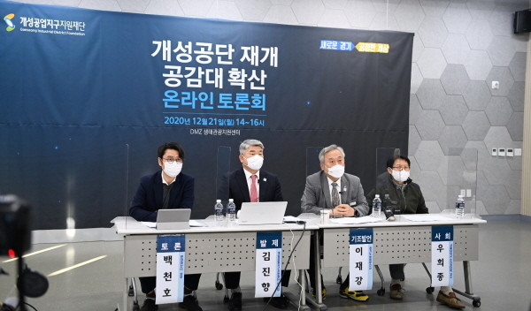 DMZ생태관광지원센터에서 진행된 이번 온라인 토론회에는 이재강 평화부지사, 김진향 개성공입지구지원재단 이사장, 관계 전문가 등이 참여해 개성공단 재개의 중요성과 향후 추진 방향에 대해 의견을 주고받았다.