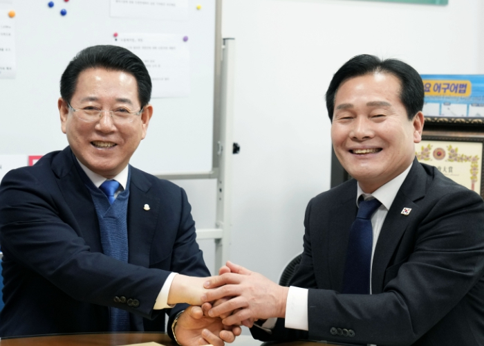 ▲ 김영록 전라남도지사가 18일 오후 국회에서 주철현 더불어민주당 전남도당위원장을 만나 여수 석유화학 산업위기 선제대응지역 지정 및 도 주요 현안 해결을 위한 건의 등 국회 차원의 협조를 요청하고 있다. |
