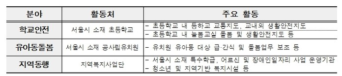 선발된 참여자는 초등 늘봄학교, 공·사립 유치원, 지역사회 복지시설 등 돌봄과 안전이 필요한 현장에 배치된다. 특히 초등학교 등하교 안전지도, 유치원 급식·돌봄 보조, 지역사회복지시설 운영 보조 등 ‘안전도시 서울’을 위한 생활 밀착형 돌봄·안전 분야에 집중된다.
