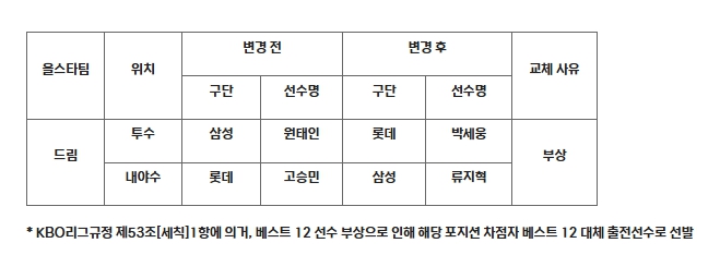 2025 신한 SOL뱅크 KBO 올스타전 출전 예정이었던 드림 올스타 원태인(삼성)과 고승민(롯데)이 부상으로 인해 각각 박세웅(롯데)과 류지혁(삼성)으로 교체됐다.