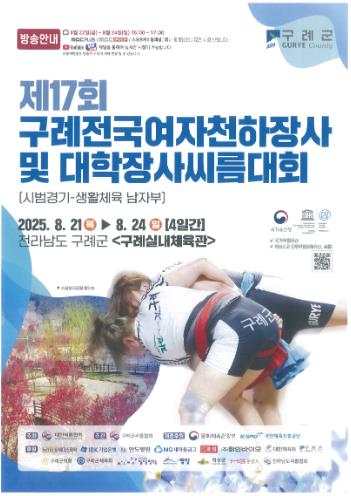 전남 구례군은 오는 8월 21일부터 24일까지 4일간 구례실내체육관에서 ‘제17회 구례전국여자천하장사 및 대학장사씨름대회’를 개최한다.