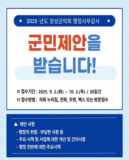 장성군의회는 오는 9월 2일부터 10월 2일까지 30일간 ‘2025년도 행정사무감사 군민제안 창구’를 운영한다고 밝혔다.
