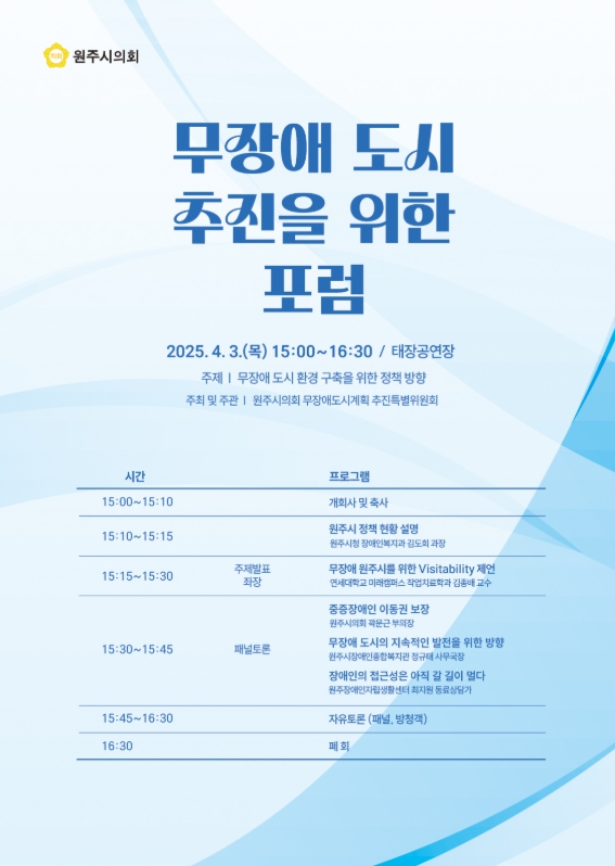 원주시의회 ‘무장애도시계획추진특별위원회’는 오는 4월 3일 목요일 오후 3시 태장공연장에서 '무장애 도시 추진을 위한 포럼'을 개최한다. 이번 포럼은 무장애 도시 환경 구축을 위한 정책 방향을 모색하고, 시민의 관심과 참여를 높이기 위해 마련됐다.