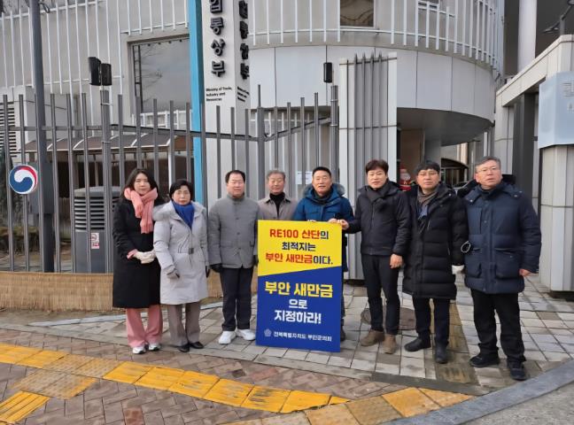부안군의회는 농생명용지 7공구의 산업용지 전환과 새만금 RE100 국가산단 지정을 새만금 기본계획(MP) 변경에 반드시 반영해 달라는 지역사회의 염원을 정부에 직접 전달하기 위해, 부안군의회 의원, 김슬지 도의원 등이 지난 15일부터 산업통상자원부, 농림축산식품부 등 세종시 청사 앞에서 새만금으로 지정하라는 피켓 시위를 이어갔다.
