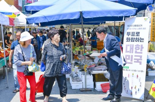 김 군수는 시장을 오가는 주민들을 만나 신성한 한 표의 소중함을 강조하고 군민의 선거 참여를 독려했다.