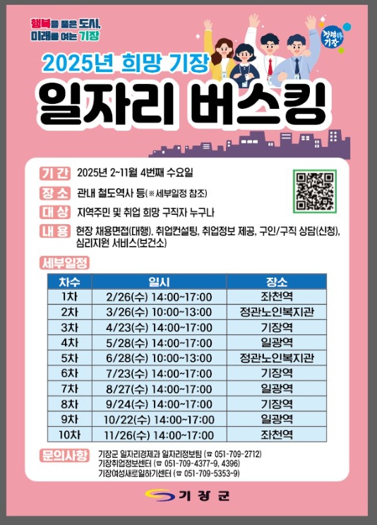 한편, ‘2025년 희망 기장 일자리 버스킹’의 구체적인 세부 일정은 기장군청 홈페이지에서 확인 가능하며, 배포되는 안내문의‘QR코드’를 이용하면 행사 일정을 빠르게 검색이 가능하다.