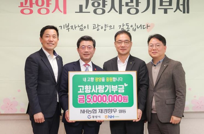 조명관 농협경제지주 축산발전기금 사무국장은 “내고향 광양을 향한 애정으로 매년 기부에 동참하고 있다”며 “앞으로도 농촌과 상생하는 고향사랑기부제의 활성화를 위해 한 발짝 더 뛰는 농협이 되겠다”고 말했다.