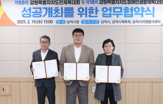 삼척시가 2월 19일 삼척시체육회, 삼척시자원봉사센터와 제60회 강원특별자치도민체육대회 및 제18회 강원특별자치도장애인생활체육대회의 성공개최를 위한 업무협약을 체결했다.