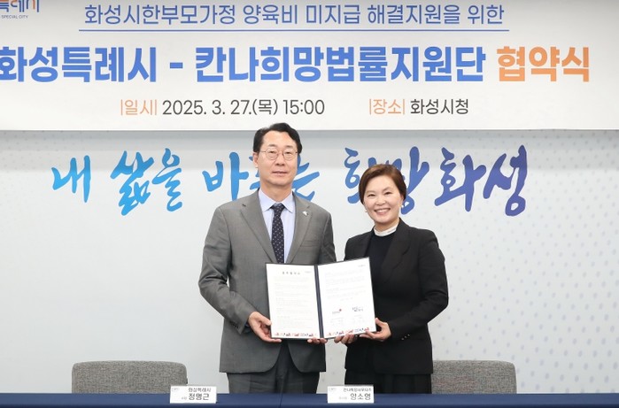 이날 협약식에는 정명근 화성특례시장, 양소영 칸나희망서포터즈 이사장 등이 참석해, 한부모 가정의 복지 증진과 양육비 문제 해결을 위한 긴밀한 협력을 약속했다.