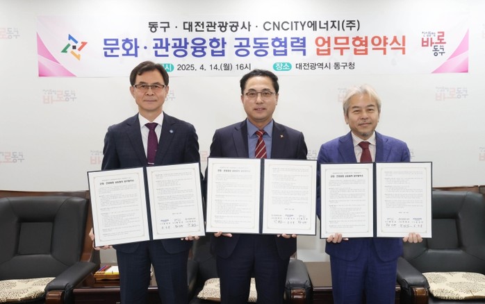 대전 동구는 대전관광공사, CNCITY에너지(주)와 함께 원도심 문화·관광 경쟁력 강화 및 활성화를 위한 3자 간 업무협약을 체결했다고 14일 밝혔다.