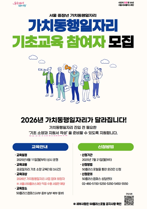 서울시50플러스재단이 2026년 ‘가치동행일자리’ 참여를 희망하는 중장년 시민을 위해 올해 처음으로 필수 기초교육을 도입하고 8월부터 본격 운영한다. 참여자와 현장 기관 간의 이해 차이를 줄이고 초기 적응에 대한 부담을 낮추기 위한 조치로 기초 소양과 실무역량을 미리 갖추도록 참여 방식을 개편했다.