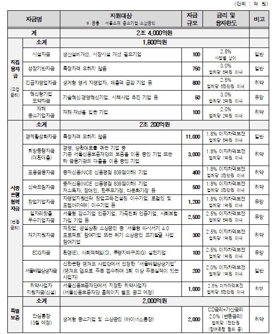 자금 유형별로는 ▴중소기업육성기금 재원으로 융자해 주는 ‘직접 융자금(고정금리)’ 1,800억 원 ▴시중은행 재원으로 자금을 융자, 대출금리 이자 일부를 서울시가 보전하는 ‘시중은행 협력자금(변동금리, 이자차액보전)’ 2조 200억 원 ▴마이너스통장 방식의 ‘안심통장(특별보증)’ 2,000억 원을 각각 공급한다.