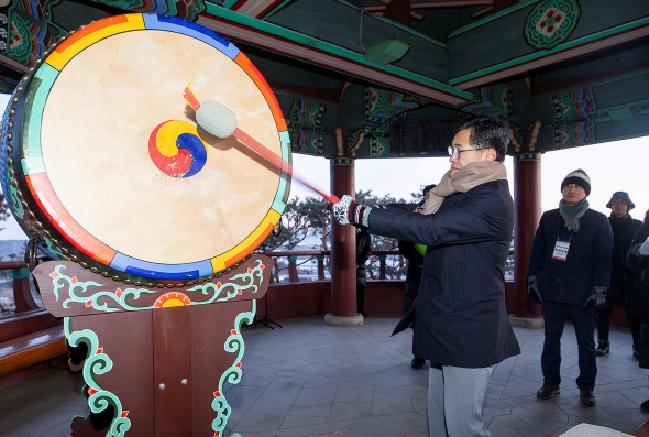 | ▲ 2026년 용왕산 해맞이 행사에서 이기재 양천구청장이 대북 타고로 병오년의 힘찬 출발을 알리고 있는 모습 |