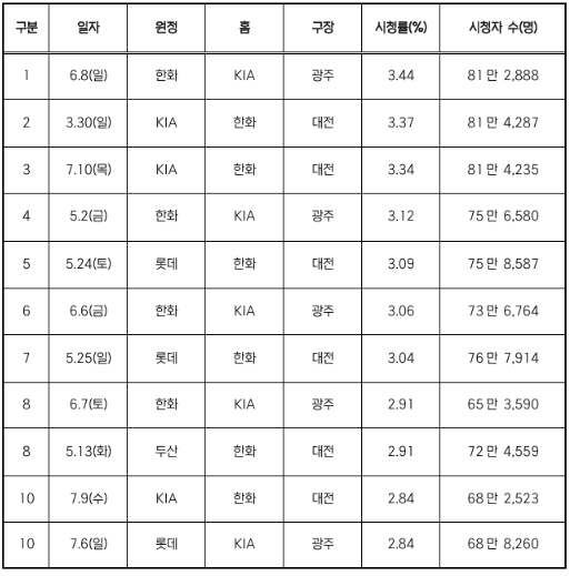 ▲ 2025 KBO 리그 전반기 시청률 TOP 10 경기 |