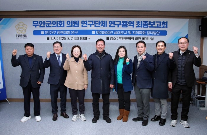 무안군의회는 2월 7일 무안군의회 세미나실에서 의원연구단체인 '1인가구 정책발전 연구회'와 '여성농업인 정책 연구회'가 주관한 연구용역 최종보고회를 개최했다.