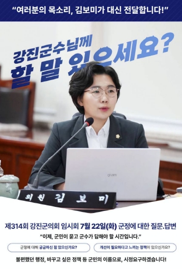 김보미 강진군의회 의원은 22일 열린 제314회 임시회 군정질문에서 강진원 군수와 일문일답 형식의 질의를 통해, 특정 외지업체에 집중된 협상계약 실태와 불투명한 계약정보공개시스템 운영의 문제점을 조목조목 지적하며, 공정한 계약체계 마련을 통한 지역경제 회복을 강도 높게 촉구했다.