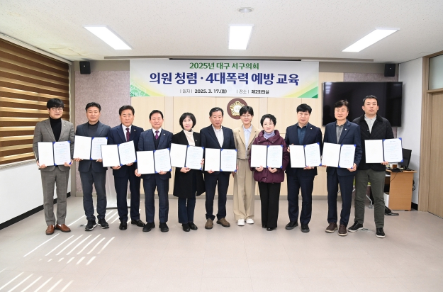 대구 서구의회는 14일과 17일 양일간 제2회의실에서 의원 전원을 대상으로 ‘의원 역량강화 및 청렴·4대 폭력예방 교육’을 실시했다.