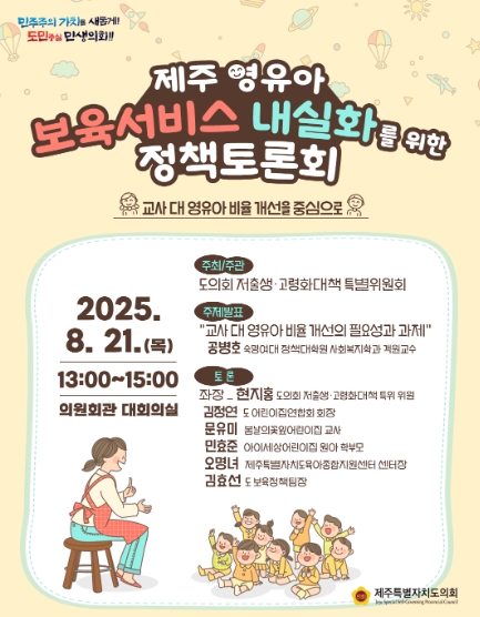 이날 토론회는 특별히 어린이집 교사 대 영유아 비율 개선을 주제로 열리며, 재주특별자치도의회 저출생‧고령화대책 특별위원회 주최‧주관으로 열린다.