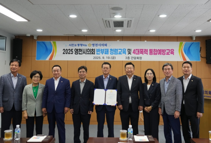 영천시의회는 지난 19일 의회 간담회장에서 시의원 전체를 대상으로 반부패·청렴교육 및 4대 폭력예방 통합교육을 실시했다.