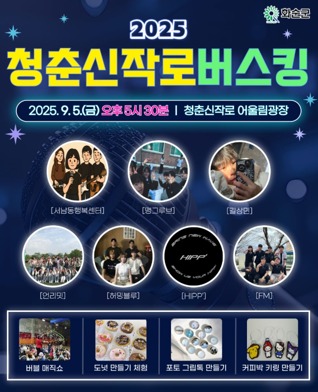 화순군은 오는 9월 5일 금요일 오후 6시 청춘신작로 어울림광장에서 청년 아티스트들의 버스킹 공연을 개최한다고 밝혔다.