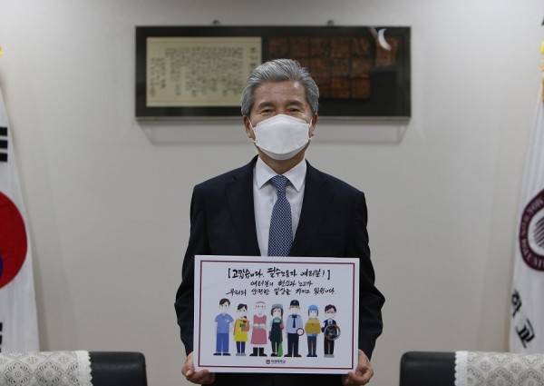 권혁대 총장은 필수노동자들의 이미지가 인쇄된 팻말에 직접 손글씨로 ‘고맙습니다. 필수노동자 여러분! 여러분의 헌신과 노고가 우리의 안전한 일상을 지키고 있습니다’란 내용을 적어 사진을 찍은 뒤 대학 누리집과 사회관계망서비스(SNS) 계정 등에 올렸다.