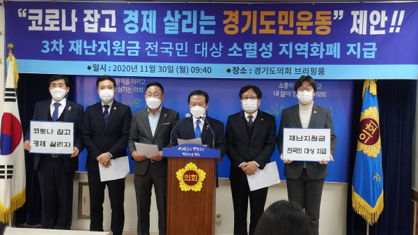 경기도의회 김명원 의원(건설교통위원회 위원장, 더불어민주당, 부천6)과 뜻을 같이한 30명의 의원은 11월 30일(월) 경기도의회 3층 브리핑룸에서 전국민을 대상으로 한 제3차 재난지원금을 지역화폐로 지급할 것을 촉구하는 기자회견을 가졌다.