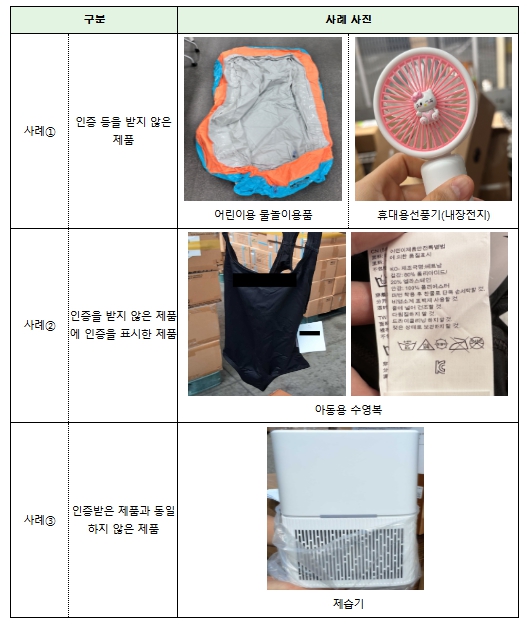 이외에 적발된 물품으로는 △안전 인증을 받지 않은 어린이용 물놀이용품, △인증 당시와 내부 설계가 상이하여 안전성이 담보되지 않은 제습기 등이 확인됐다.