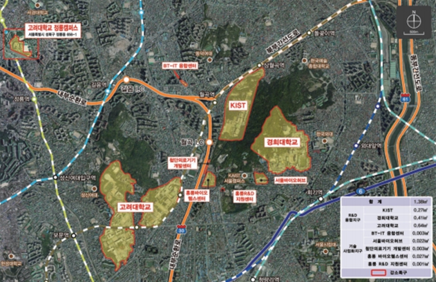 홍릉 강소연구개발특구는 서울 성북구 안암동・정릉동과 동대문구 회기동 일대 약 1.38㎢ 규모로 지난 2020년 8월에 지정・고시됐다. KIST, 경희대학교, 고려대학교 등의 기술 핵심 기관을 중심으로 배후 공간에 위치한 서울바이오허브, BT-IT융합센터 등이 바이오・의료 클러스터를 형성하고 있다.