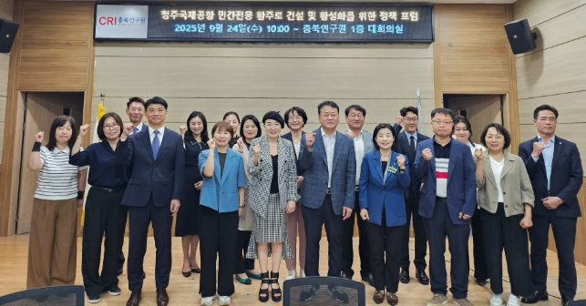 좌장을 맡은 청주대학교 무역학과 이재영 교수는 “이번 정책 포럼은 지역사회가 청주국제공항 활성화를 위해 선제적으로 고민해야 할 정책 과제 및 이슈 등을 논의하는 자리”라며 “앞으로 청주공항 민간 전용 활주로 신설과 공항 활성화를 통해 지속 가능한 지역경제 성장의 선순환 생태계가 구축될 수 있도록 다양한 주체들과 협력할 수 있는 거버넌스를 확대해 나갈 필요가 있다”고 말했다.