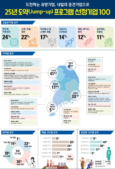 중소벤처기업부는 23일 금년부터 본격적으로 시행하는 ‘도약(Jump-Up) 프로그램’의 지원기업 100개사를 최종 선발했다고 밝혔다.