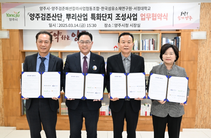 양주시가 14일 오후 시청 집무실에서 양주검준패션칼라사업협동조합, 한국섬유소재연구원, 서정대학교와 함께 ‘뿌리산업 특화단지 지정 및 지원사업 추진’을 위한 ‘업무협약’을 체결했다고 밝혔다.