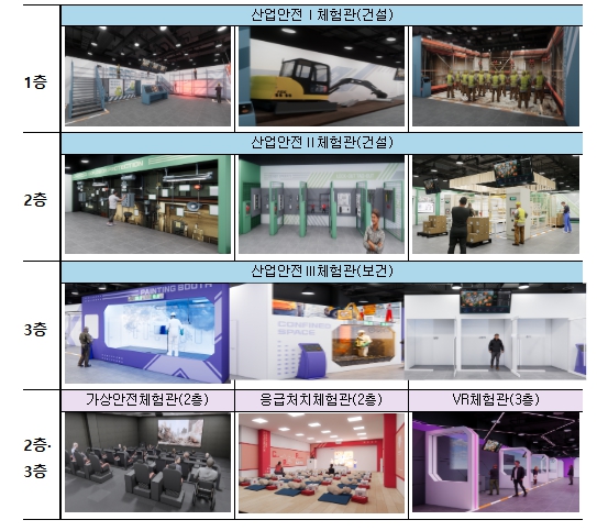 인천 안전체험교육장은 6개 테마관(산업안전1체험관, 산업안전2체험관, 산업안전3체험관, 응급처치체험관, 가상안전체험관, VR체험관)과 65종의 교육콘텐츠로 구성되어 추락, 끼임 등 산업현장에서 자주 발생하는 재해 유형을 실감 나게 체험할 수 있다.