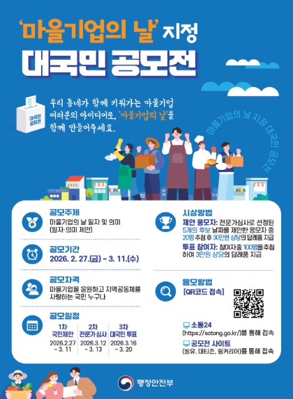 행정안전부는 ‘마을기업’에 대한 국민의 이해를 높이고 마을기업 활동을 활성화하기 위해 법정기념일인 ‘마을기업의 날’의 날짜와 의미를 국민이 직접 정하는 대국민 공모를 진행한다고 밝혔다.