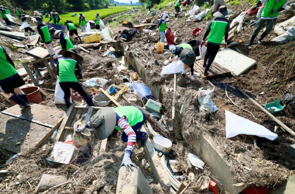 집중호우로 피해 입은 아산시 곡교1리 찾아 140여 명 자원봉사활동