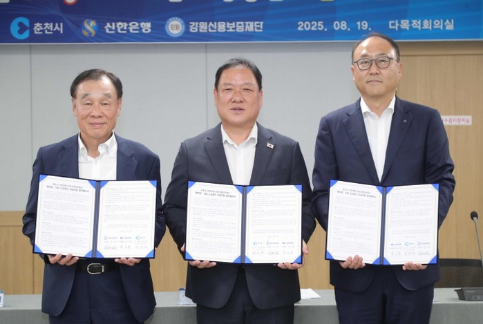 춘천시가 19일 시청에서 신한은행, 강원신용보증재단과 ‘땡겨요’ 가입 소상공인 지원을 위한 업무협약을 체결했다.