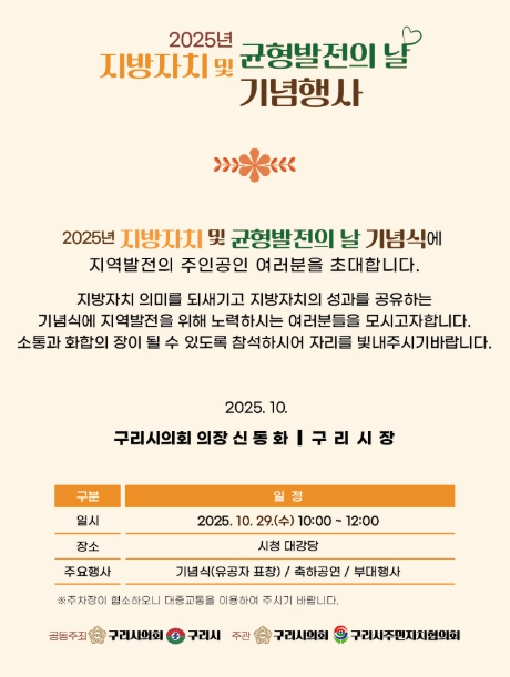 구리시의회는 오는 10월 29일에 구리시청 1층 대강당에서 ‘2025년 지방자치 및 균형발전의 날 기념식’을 개최한다.